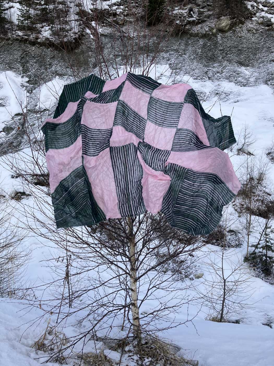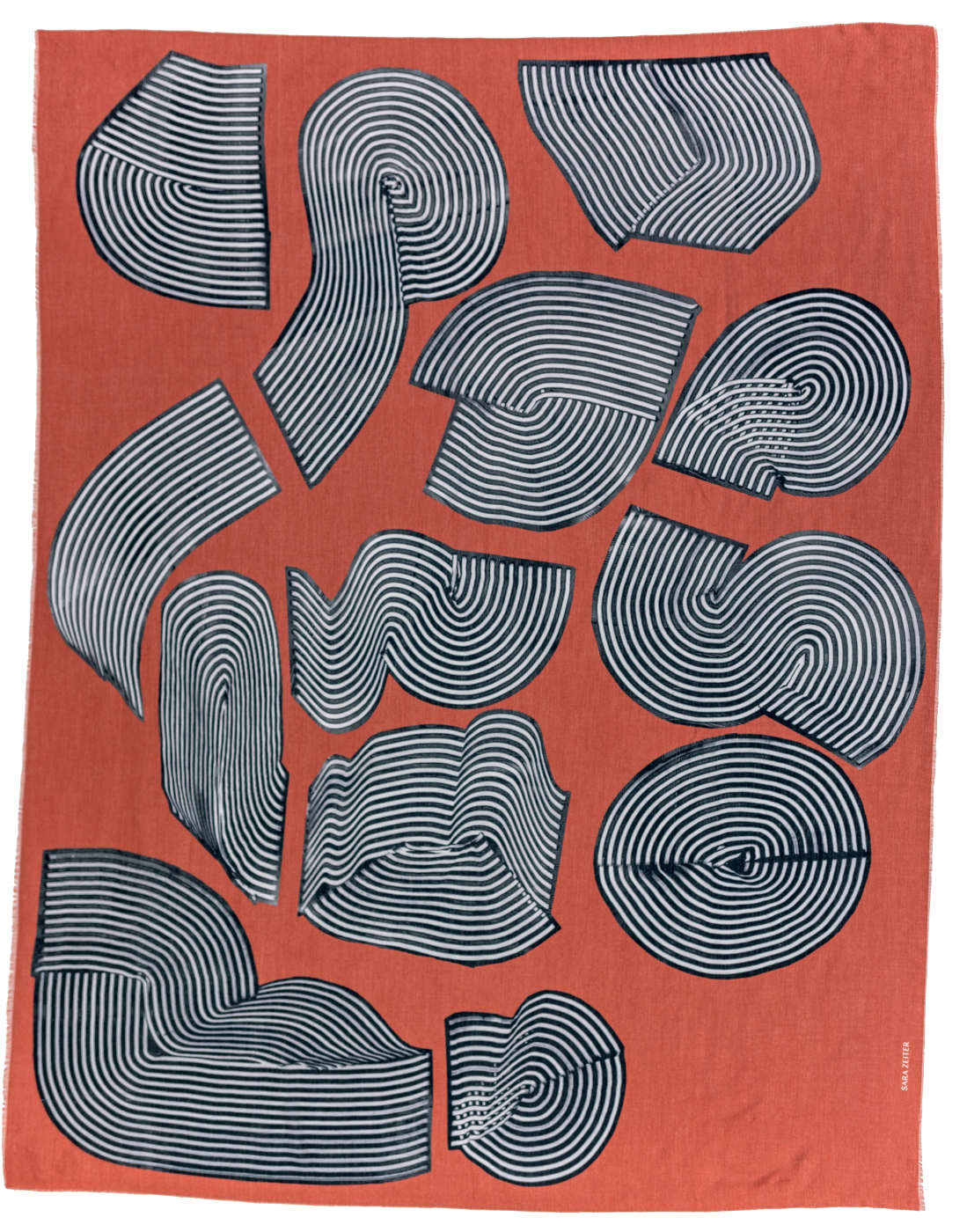 Sara Zeiter arbeitete lange Jahre als freie Illustratorin, als Bildredaktorin bei Zürcher Printmedien, absolvierte die Textilfachklasse an der Höheren Schule für Gestaltung ZHdK Zürich, gibt Zeichnungskurse, gestaltet Yogaplakate und ist seit 2023 auch als Psychomotoriktherapeutin tätig. In ihrer Arbeit lässt sie sich vor allem von Neugierde und ihrem umfangreichen Archiv an Fotos, Zeichnungen, Malerei und Skizzen inspirieren. Ihre Tücher und Foulards bemalt und bedruckt Sara Zeiter mit Pinseln, Schwämmen und Moosgummischablonen direkt auf dem Boden in ihrem Atelier: «Diese Arbeitsweise hat etwas Archaisches, der Körper wird mit einbezogen.»