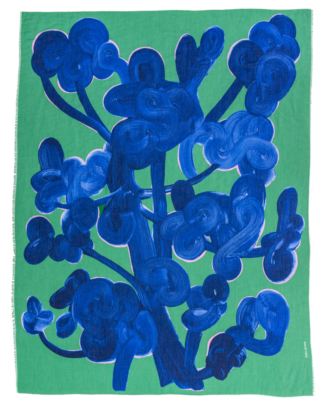 Seit 2019 hat Sara Zeiter drei Serien aus Baumwolle und Wolle veröffentlicht. Ihre aktuelle Serie #4 ist aus angenehm weichen Mischgewebe aus FSC-zertifizierten Modalfasern und Seide gefertigt. Modal wird aus Buchenholz-Cellulose gewonnen, einer nachhaltigen und hochwertigen Alternative zu Viskose. Die markanten, farbstarken Designs wurden mit Pinseln und Spachteln auf Folien kreiert, fotografisch digitalisiert, anschliessend koloriert und in Italien per Digitaldruck produziert. Die Fransen der 110 x 140 cm grossen Tücher sind von Hand geschnitten und unterstreichen saumlos den sanften Griff des Textils. Die Foulards können bei 30 Grad gewaschen werden.