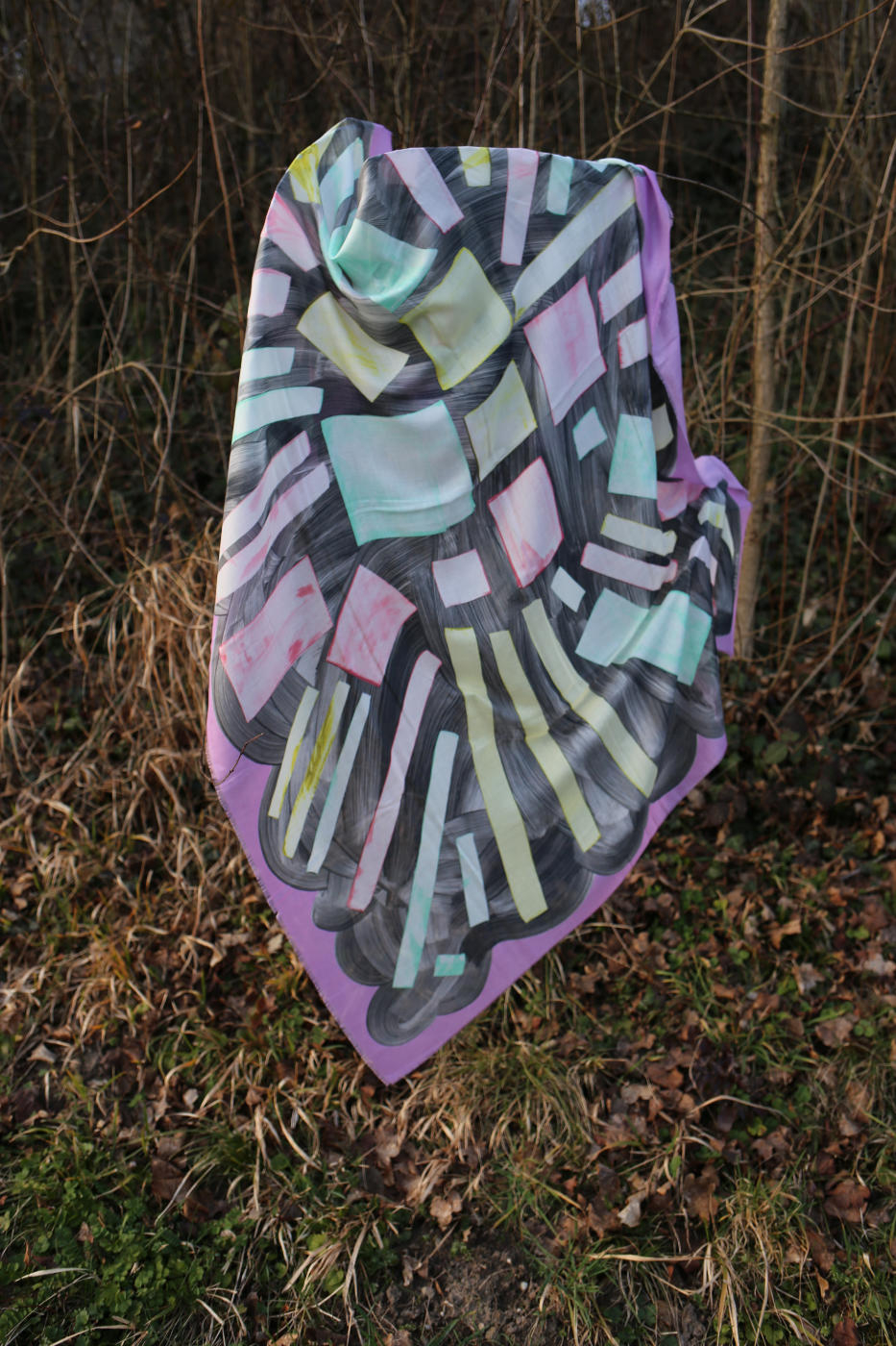 Die Textilgestalterin Sara Zeiter entwirft in ihrem Atelier neben der Zürcher Josefwiese handbemalte und handbedruckte Tücher. Sie arbeitet mit Pinseln, Schwämmen und Schablonen. Ihre neuste Serie #4 umfasst zwölf farbstarke Sujets, gedruckt auf einer geschmeidigen Mischung aus Modal und Seide. Jedes Motiv ist zudem auch als Karte erhältlich.