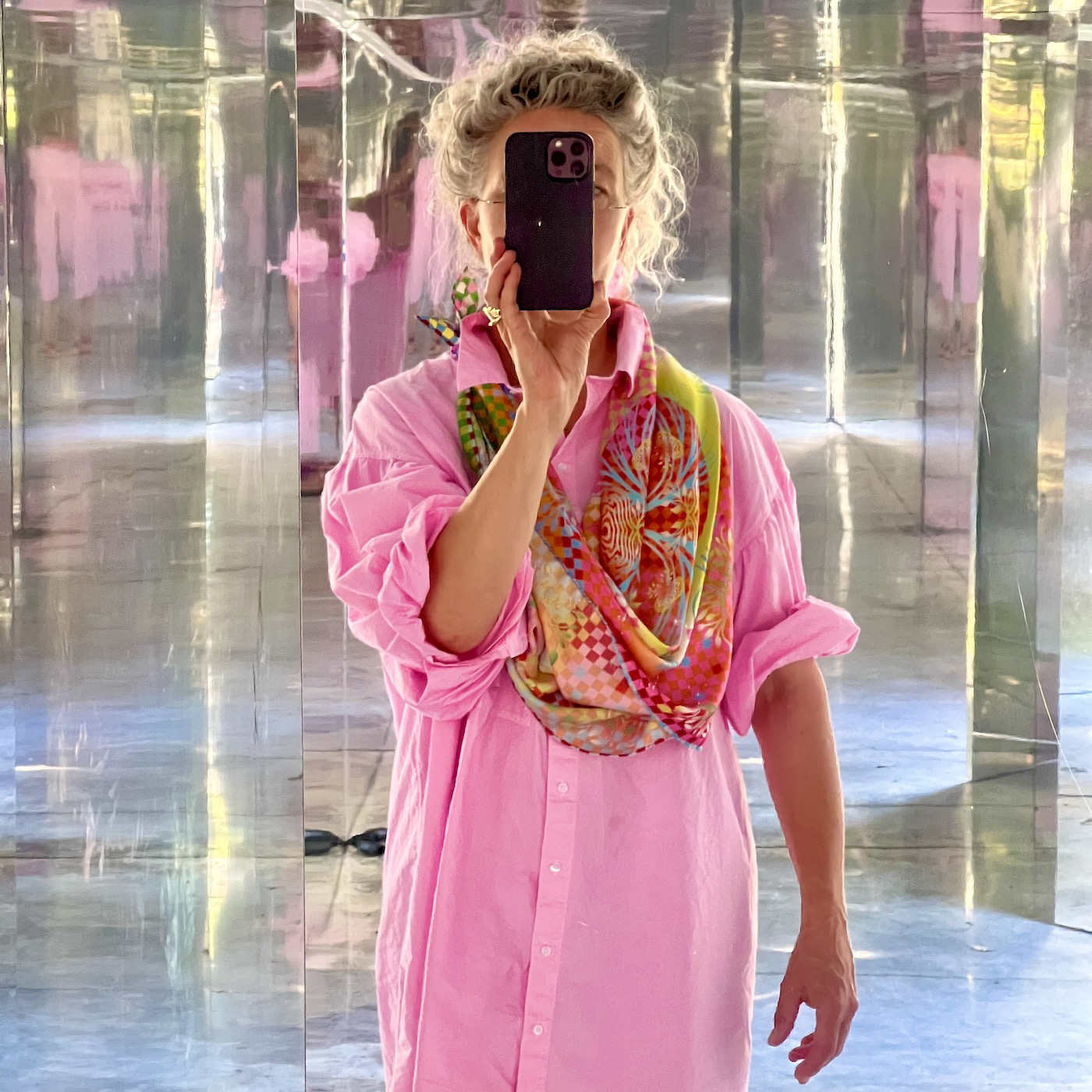 Dass Elisabeth Schwarzenbeck eines Tages wunderschöne Seidenfoulards gestalten würde, lag nicht auf der Hand. Ihre berufliche Biografie liest sich beinahe abenteuerlich. Ursprünglich war sie Kindergärtnerin und wandte sich danach der Gastronomie zu: Sie arbeitete in der Genossenschaft Löwen und war am Aufbau des Hotel-Restaurants Baseltor in Solothurn beteiligt, parallel baute sie ihren eigenen Catering-Service auf. Es folgte ein Studium der Visuellen Kommunikation in Luzern. Im Rahmen ihrer grafischen Arbeit bei Les Ateliers du Nord in Lausanne war Elisabeth Schwarzenbeck massgeblich am Pavillon «Signalschmerz» an der Expo.02 beteiligt. Weiter bekleidete sie verschiedene Positionen am Studiengang Visuelle Kommunikation an der Hochschule der Künste Bern HKB.