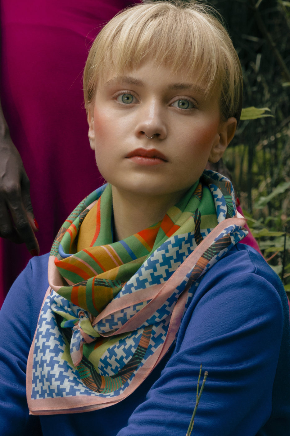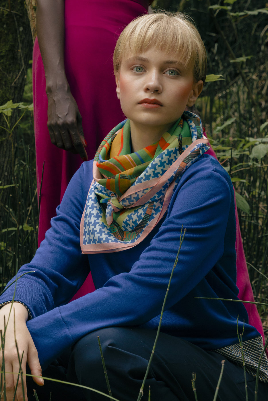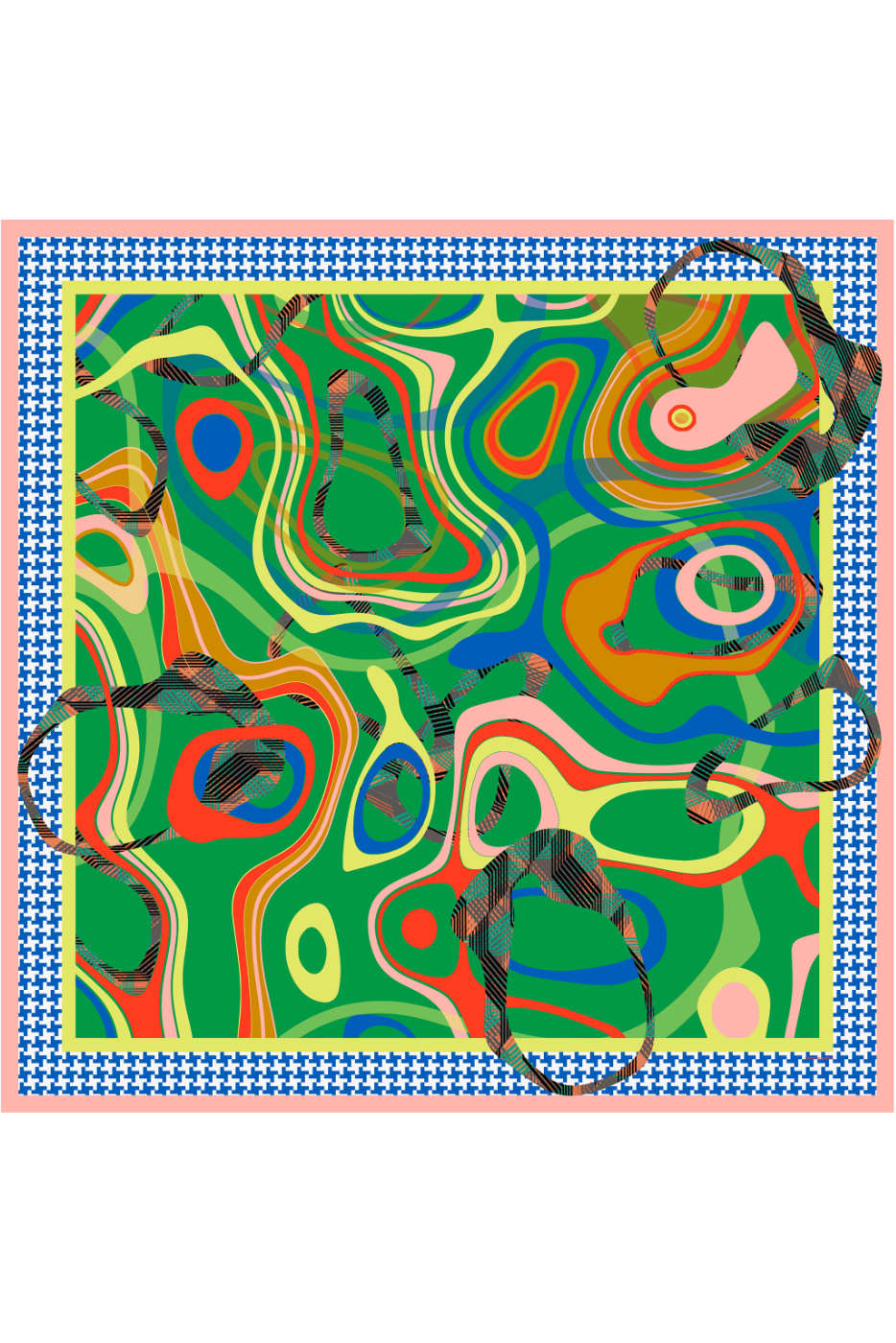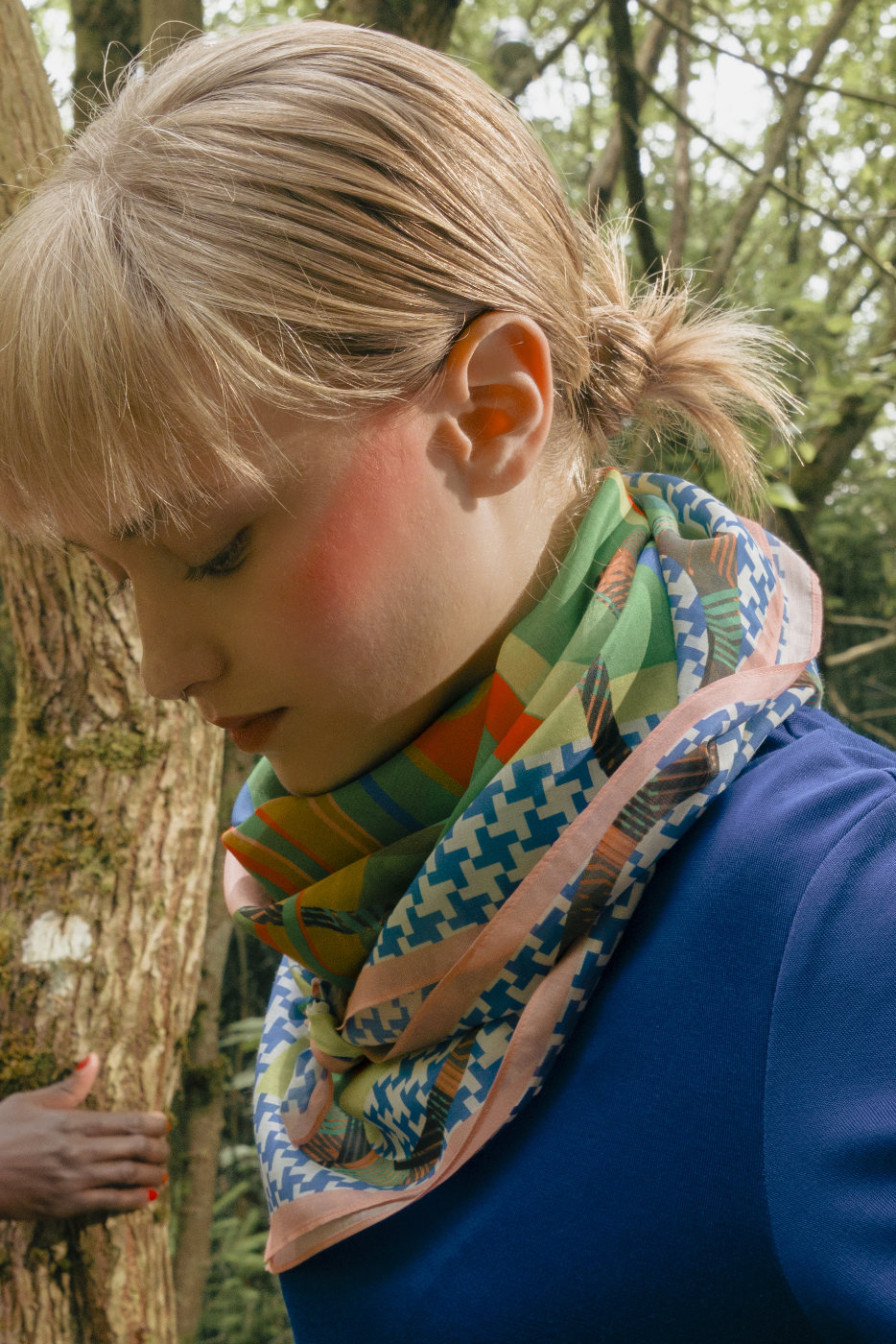 Die studierte Textildesignerin und passionierte Tänzerin Nathalie Pellon entwirft ihre Stoffdrucke in Bern. Die Designs entstehen nach ausgiebigen Recherchen collageartig mittels Fotografie, Zeichnungen oder Malereien und werden schliesslich am Computer bearbeitet. Das maschinenrollierte Schaltuch wurde digital mit umweltfreundlicher Farbe auf Wasserbasis in Grossbritannien bedruckt.